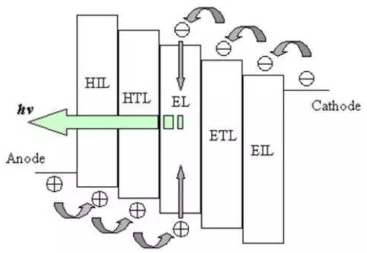 典型的OLED器件由多層功能結(jié)構(gòu)組成,包括陽極(Anode)、空穴注入層(HIL)、空穴傳輸層(HTL)、有機發(fā)光層(EL)、電子傳輸層(ETL)、電子注入層(EIL)及陰極(Cathode)。這些層通過設(shè)計形成“階梯式”能級分布(圖一),促使來自陽極的空穴與陰極的電子高效傳輸至發(fā)光層結(jié)合并釋放光子。通過摻雜(Dopant)技術(shù)(表一、表二),可精準(zhǔn)調(diào)控各層材料的能級狀態(tài),從而提升器件效率與壽命。